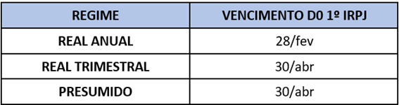 Tendo com base na data de vencimento do primeiro pagamento do IRPJ para os regimes tributários do Lucro Real Anual, Lucro Real Trimestral ou Lucro Presumido, pode-se indicar as seguintes datas como referência para opção: